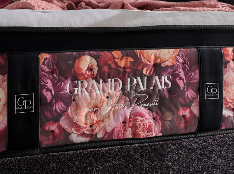 La collection joue sur des tons noirs et pourpres, évoquant la profondeur d'une nuit élégante. Chaque matelas est conçu comme un jardin secret de repos, mêlant richesse ornementale et finitions d'exception.