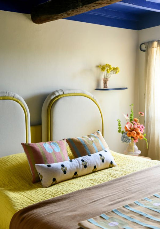 Elle imagine une tête de lit poétique, comme un hommage à l’union de deux êtres partageant le même lit. Ce trait d’union symbolique devient un détail visuel fort, incarnant le lien, l’amour et la complicité.