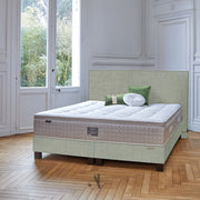 Doté d’un accueil en latex Pulse 100 % naturel, il offre un confort exceptionnel grâce à son élasticité naturelle, à la fois moelleuse et durable. Son couchage 100 % ressorts ensachés (1189 ressorts en 160x200 cm) assure un soutien point par point, une indépendance de couchage irréprochable et une ventilation optimale. Le garnissage noble en coton bio, laine, soie et fibres polyester crée un cocon naturellement respirant, thermorégulé et durable.