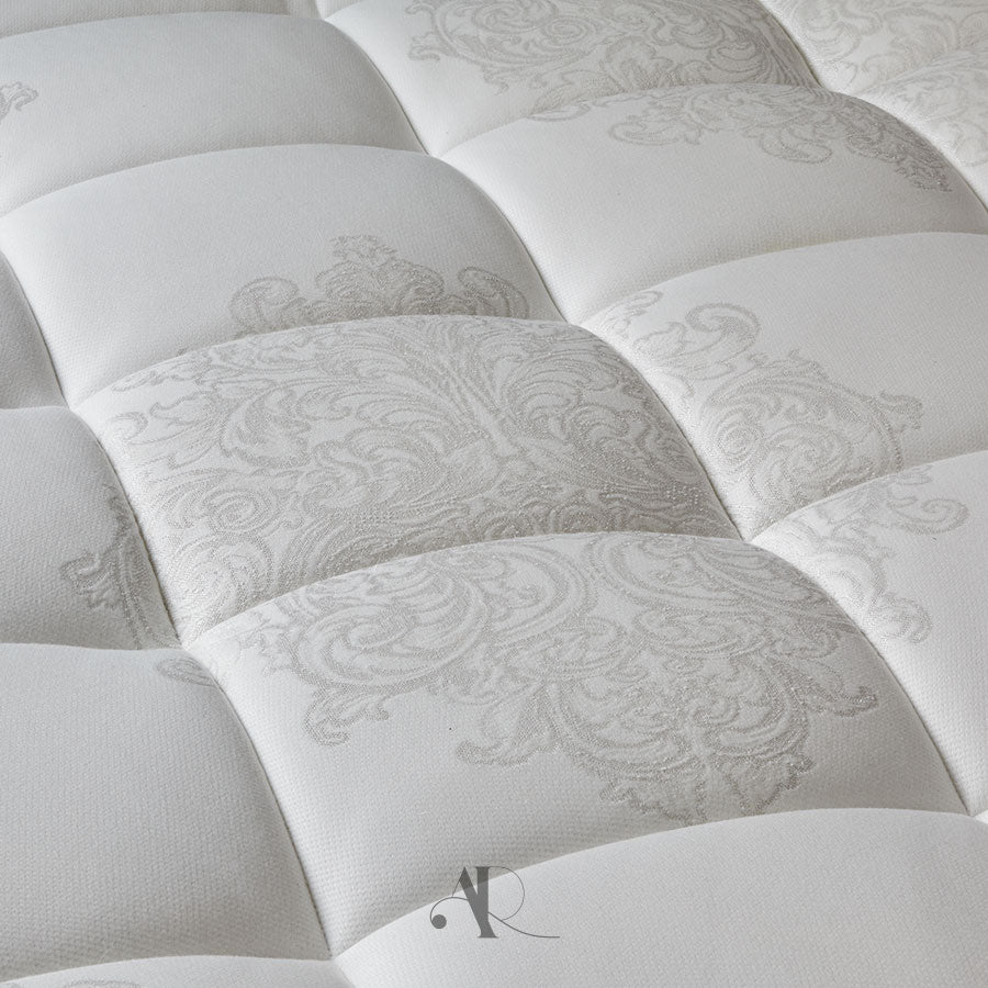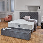 Son accueil en mousse à effet mémoire de forme (50 kg/m³) épouse parfaitement les courbes du corps, réduit les points de pression et favorise une relaxation optimale. La suspension de 1189 ressorts ensachés (en 160x200 cm), répartie en 5 zones de confort ergonomique, assure un soutien anatomique précis, une parfaite indépendance de couchage et une ventilation continue. Son garnissage double face — coton bio, laine, soie et fibres polyester pour l’hiver ; fibres polyester pour l’été — garantit une thermorégulation naturelle toute l’année.