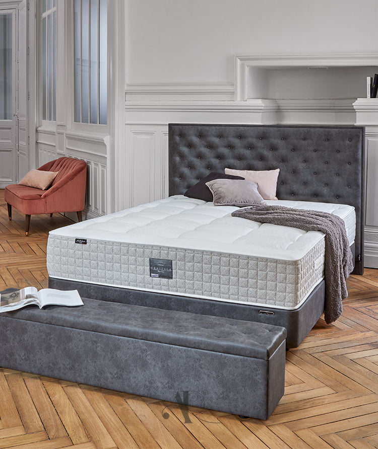 Exprimez votre style en personnalisant votre literie. Choisissez parmi plus de 40 têtes de lit sur-mesure, avec éclairage ou recharge intégrés. Associez-les à un sommier fixe ou de relaxation et complétez avec nos accessoires artisanaux : bancs-coffres, chevets, tablettes et une large palette de tissus ou décors bois.