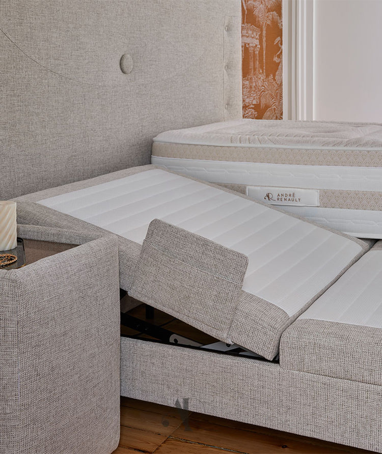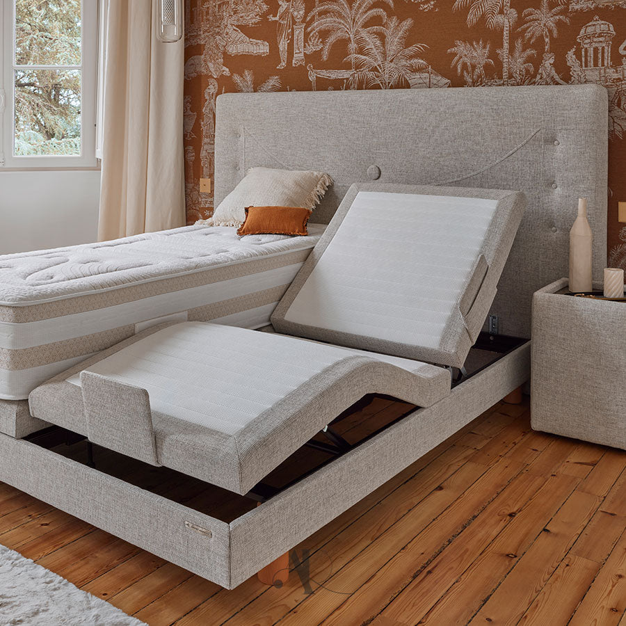 Attentifs au bien-être de chacun, nous proposons un grand choix de matières pour répondre au confort que vous recherchez, jusqu’à la solution Individuo réunissant deux conforts différents de chaque côté du lit au sein du même matelas. Vous pouvez également personnaliser votre sommier, qu’il soit fixe ou de relaxation.