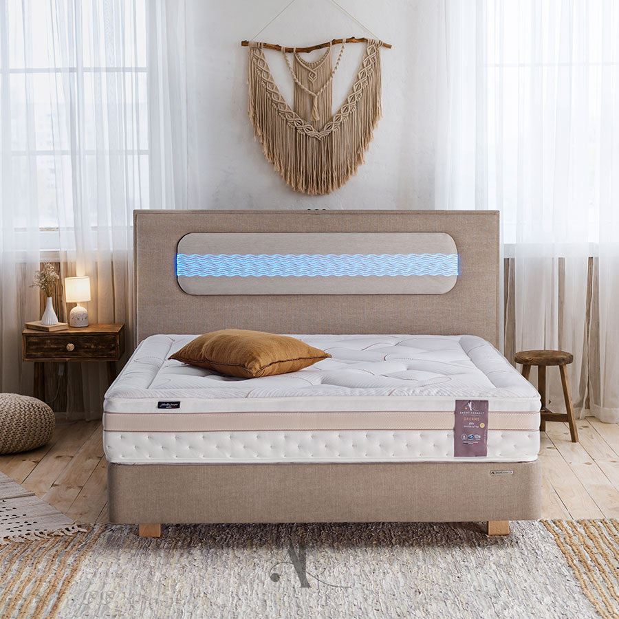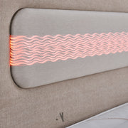 En option, un chemin lumineux sous le sommier assure un déplacement nocturne discret et sécurisant. L’option son enrichit l’expérience avec des bruits blancs ou du streaming musical, pour créer une atmosphère propice à la relaxation ou au rêve.